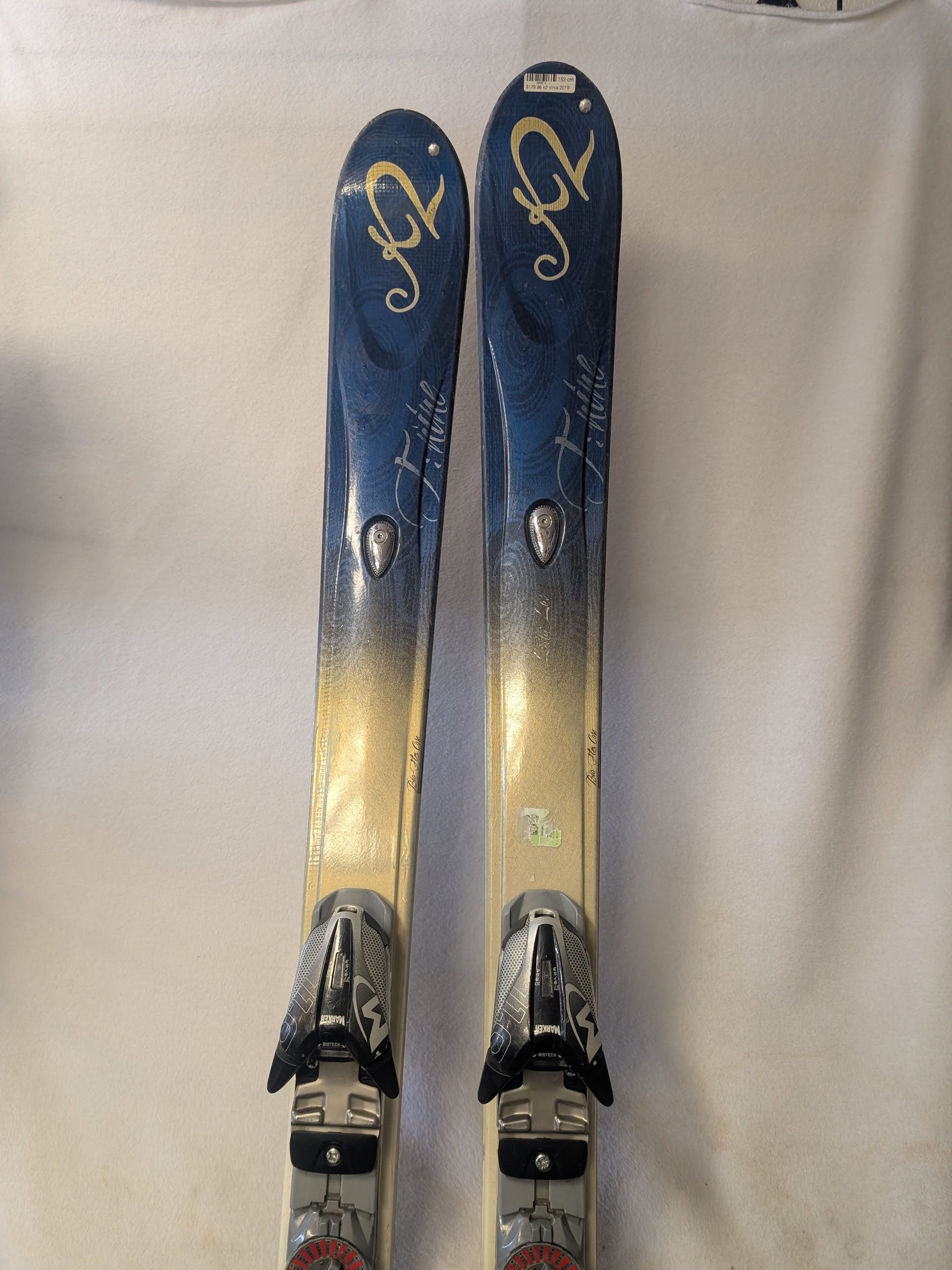 K2 Lotta Love Skis Marker Bindings Size 153 Cm Blue Used. Purchased new circa 2019 per consignor. Item Cleaned Upon Intake.